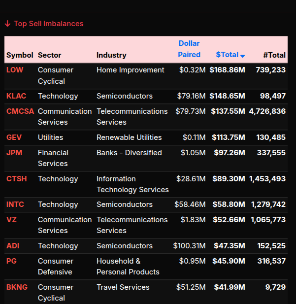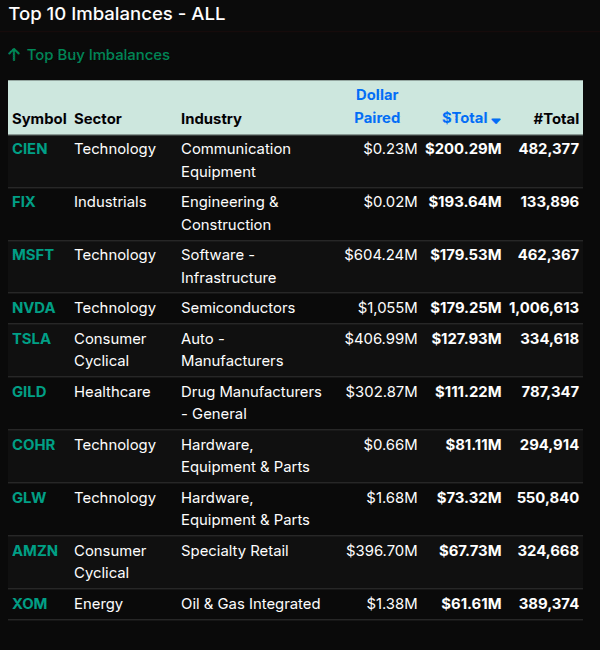 At the single-name level, sell imbalances were led by LOW ($168M), KLAC ($148M), and CMCSA ($137M), with strong representation from Technology and Communication Services. Meanwhile, buy imbalances were concentrated in selective Tech and Industrial names, including CIEN ($200M), MSFT ($179M), and NVDA ($179M), alongside TSLA ($127M). This reflects a bifurcated tape where index-level selling coexisted with targeted accumulation.
