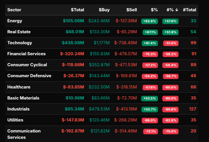 On the buy side, Energy (+63.8%), Real Estate (+67.1%), and Technology (+61.4%) showed relative demand, though notably none exceeded the +66% threshold in a meaningful way except Real Estate, suggesting less conviction compared to the sell-side pressure.
