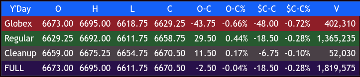 After 4:00, the ES rallied up to 6675.25 and settled at 6660.00, down 17 points or -0.25%. The NQ settled at 24,580, down 71.25 or -0.29%; the YM settled at 46,341, down 194 points or -0.42%; and the RTY settled at 2512.10, up 16.60 points or +0.67% on the day.