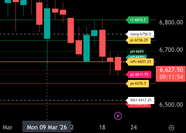 Overall, the market remains bearish below 6657.25, and rallies into resistance are likely to be sold unless buyers can establish acceptance back above the pivot. A sustained move above 6657.25 would be the first sign of strength and could shift the intraday tone back toward balance or rotation higher.