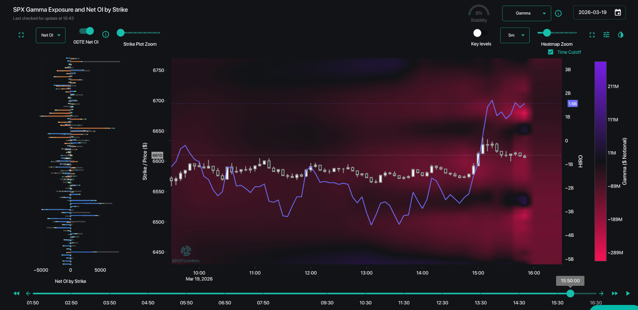 As noted in the AM Note, “negative gamma all over means that dealers should be chasing prices both higher and lower, which should exacerbate volatility.” That’s exactly why we see some big intraday movement. It’s also notable that the 0DTE put sellers around 6,530 provided support of the day, as we see HIRO flows stalled when price hit that zone.
