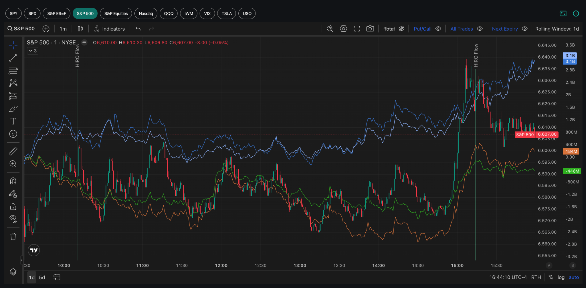 S&P 500 HIRO showed approximately +$2B in net delta on the day, driven primarily by ~$3B of 0DTE put selling (light blue line). These short-dated volatility sellers injected positive delta into the market, requiring dealers to buy underlying as their hedging flows.