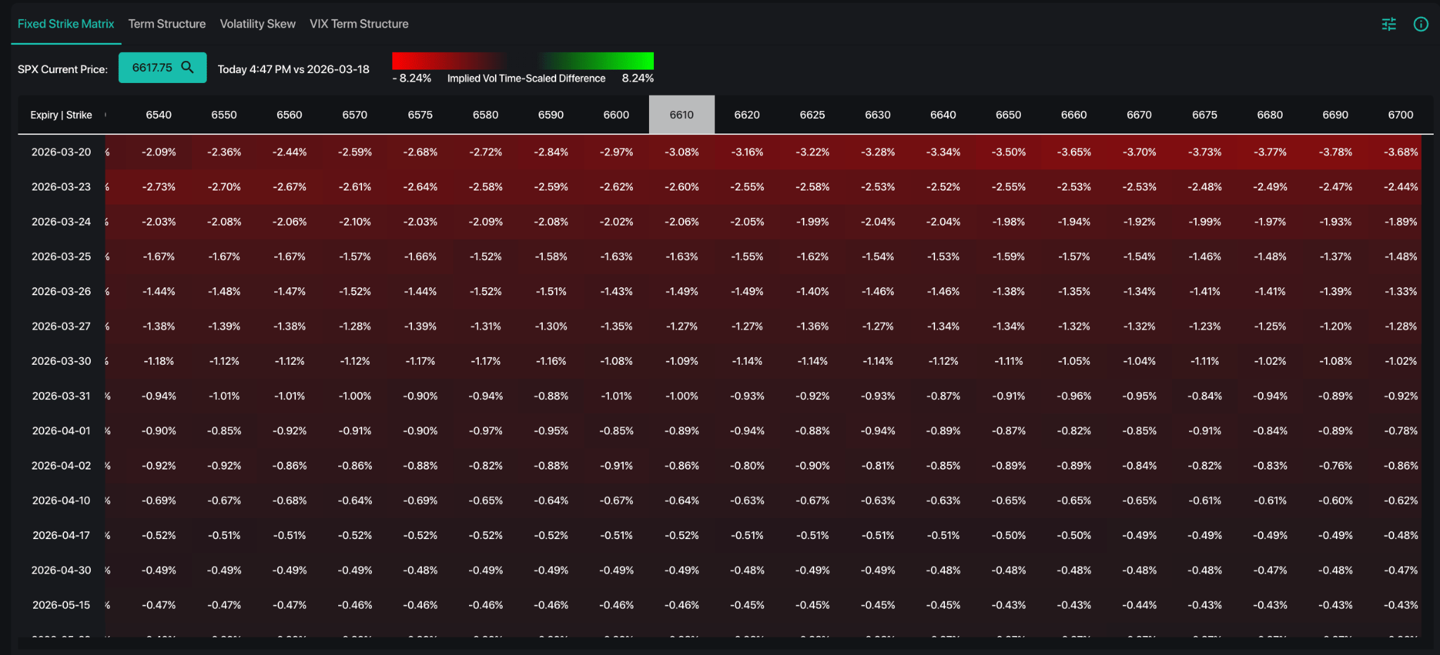 Fixed strike vols leaked lower across the board, especially the short dated ones (<=3DTE) down 2-3 vol points on the day. The “spot down, vol down” dynamic suggests that short-dated hedges were monetized, as the hedgers’ put delta decayed further. While market makers positioning implied net buying pressure, other market participants were net sellers.