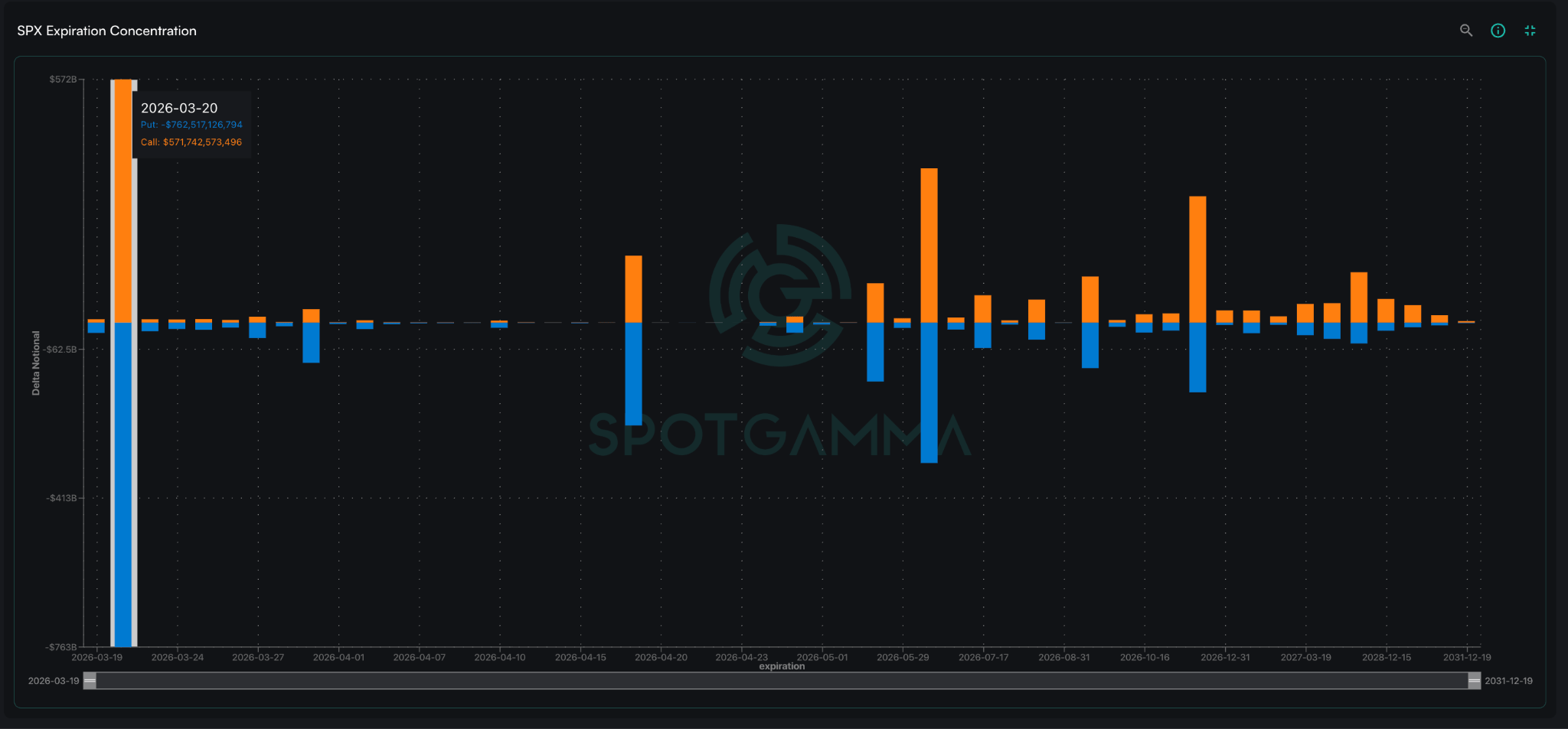 Tomorrow is March Triple Witching OPEX, where a large amount of index options, single stock options, and futures will expire. This expiration is notably larger than recent ones and may have an outsized impact on market dynamics. From a delta notional perspective, approximately $763B in puts (57%) and $572B in calls (43%) are set to expire, indicating a slightly higher concentration in puts.