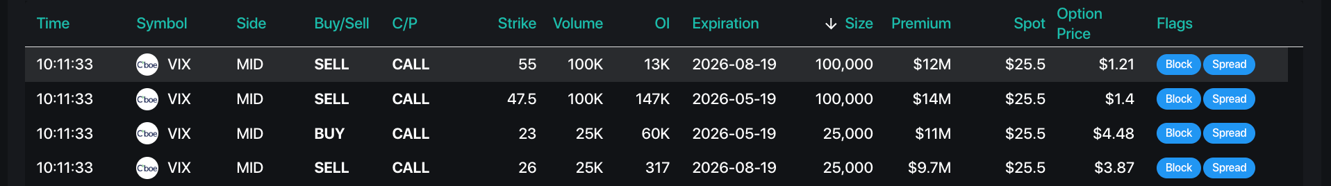 We observed short VIX call activity, with 100k contracts of VIX August 55 calls sold at $1.21 around 10:11am ET. This size exceeded existing open interest, and VIX moved lower following the trade.