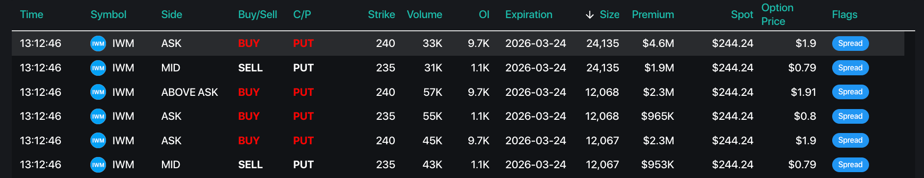 Bearish IWM flow was also notable, potentially tied to shifting rate expectations following the FOMC. Approximately 48k contracts of the IWM March 24th 235/240 put spread traded for $1.10, with size exceeding existing open interest.