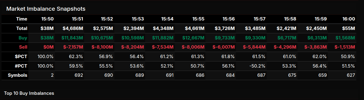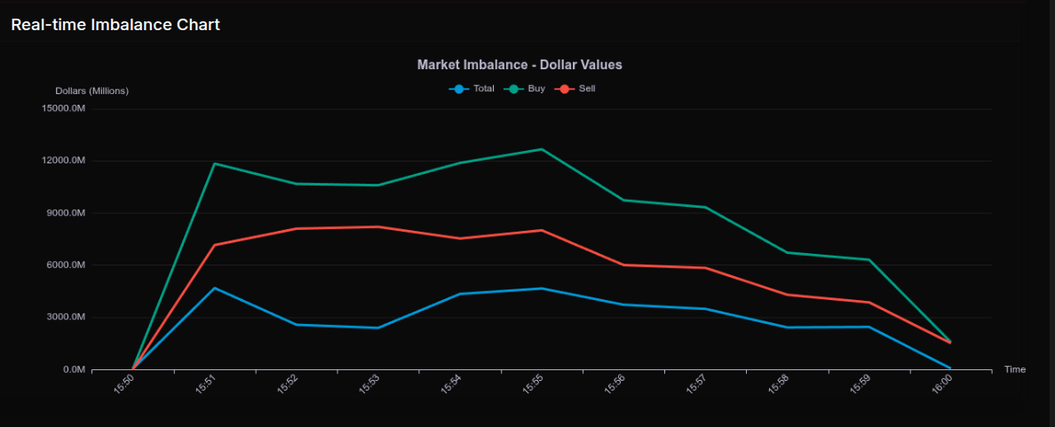 The February 27th MOC session opened with an immediate expansion in buy pressure. At 15:50, the book was essentially flat at $38M, but by 15:51, total imbalance exploded to $4.686B, driven by $11.843B in buy orders versus $7.157B for sale. The early lean registered +62.3%, firmly directional but still rotational rather than wholesale. The imbalance peaked in momentum around 15:55, with buy programs touching $12.667B while sells held near $8.006B, keeping the percentage structure consistently in the low 60s. Into the 15:58–16:00 window, both sides compressed sharply, closing with a modest $55M net and a more neutral 50.9% split, reflecting late offsetting flows.
