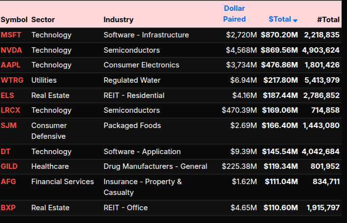 On the tape, large buy imbalances were concentrated in AMZN ($523M), LLY ($417M), JPM ($388M), COHR ($363M), and BRK.B ($302M). GOOG, TSLA, COST, META, and ABBV also showed meaningful demand. On the sell side, Technology heavyweights dominated: NVDA ($869M), MSFT ($870M), and AAPL ($476M) all carried sizable paired-off pressure. Real Estate names such as ELS and BXP added to sector weakness.