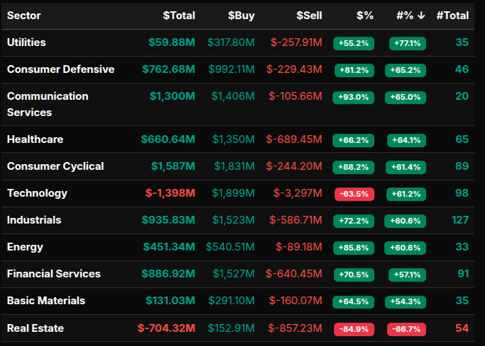 Sector rotation was aggressive. Communication Services led with a +93.0% buy lean, Consumer Cyclical printed +88.2%, Energy +85.8%, and Consumer Defensive +81.2%. These readings signal strong institutional accumulation, though not quite the >66% wholesale threshold in dollar-weighted terms across every name. Financials (+70.5%), Industrials (+72.2%), and Healthcare (+66.2%) reinforced the broad risk-on tone. Technology was the notable outlier at -63.5%, showing heavy supply, while Real Estate stood out with a -84.9% lean and -66.7% by symbol count — a clear wholesale sell imbalance and the most extreme sector reading of the session.