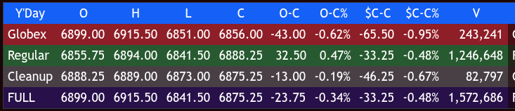 After 4:00, the ES sold off down to 6873.00 and settled at 6889.00, down 31 points or -0.45%. The NQ settled at 25.004.75, down 76.25 points or -0.30%. The YM settled at 49.000, down 531 points or -1.07%, and the RTY settled at 2634.70, down 45.90 points or -1.71% on the day.