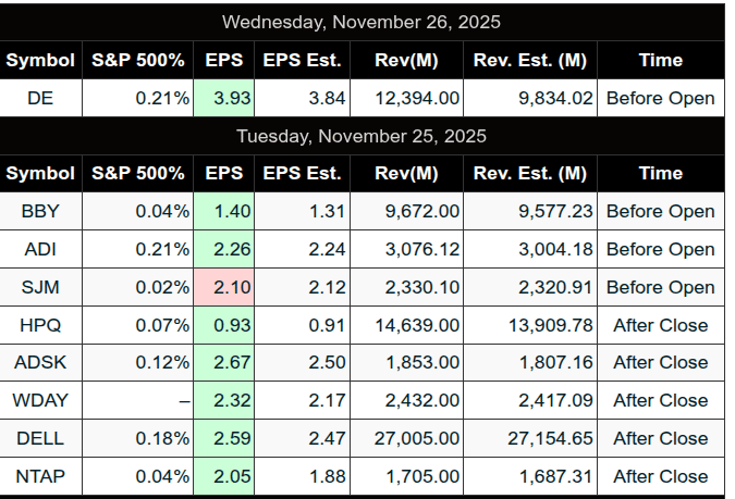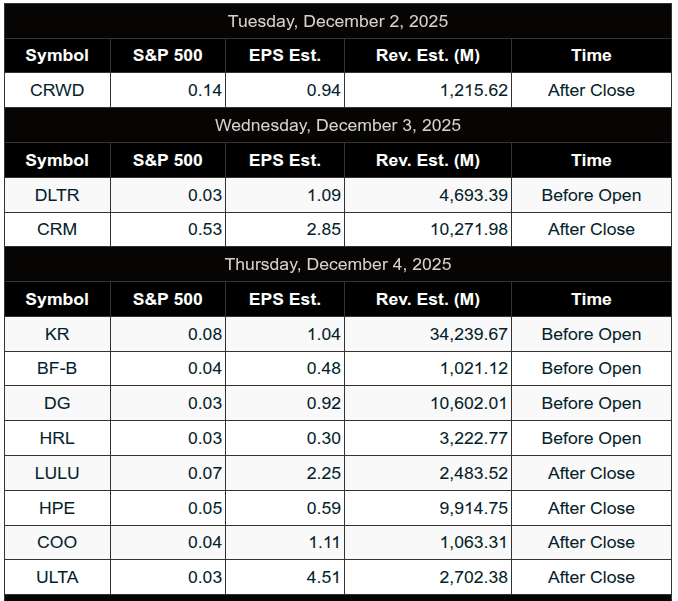 During Friday’s holiday extended Globex trade, the CME experienced an outage from a CyrusOne data center cooling failure that halted trading until 8:30 a.m. Friday and thinned post-Thanksgiving volume. Stocks closed at two-week highs and up five sessions in a row. The semiconductors and energy stocks rallied, with WTI crude up over 1%. The big November month-end rebalance, plus the index markets pricing in an 83% probability of a 25 bps Fed rate cut at the December 9–10 FOMC meeting, came even as October jobs and CPI data were scrapped and folded into delayed November reports due December 16 and 18.