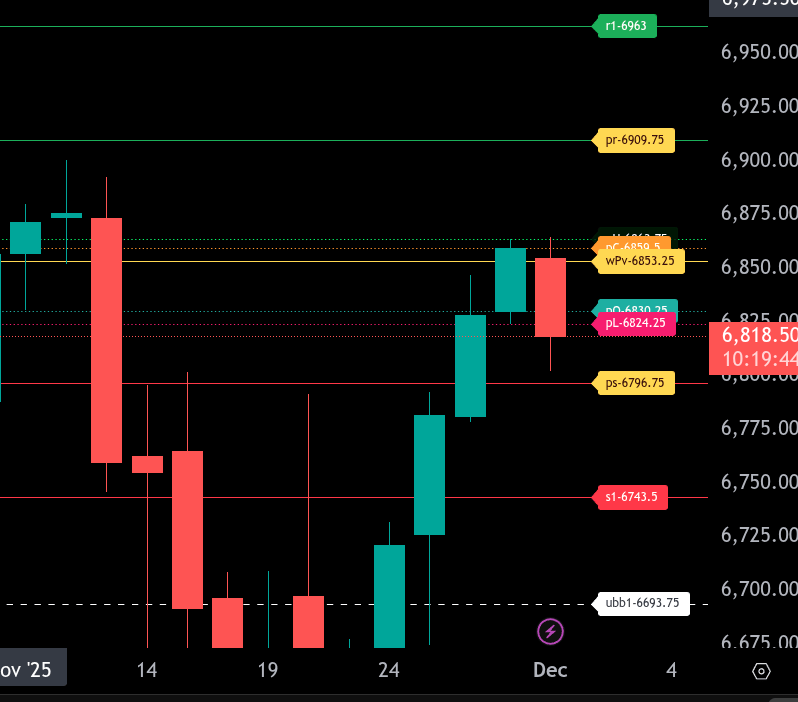 On the upside, resistance sits at 6859.50 and then the upper range target of 6909.75. A sustained move back above 6853.25 would open the door for buyers to test these levels.