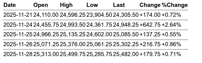 The NQ made its low on 11/20 at 24,073.27 and made a high on Friday at 25,499.75 — that’s a gain of 1,426.50 points or +5.93%. Over the last five sessions, the NQ has gained 1,176.50 points or +4.84%, and is now 899.25 points off its 26,399.00 all-time contract high.