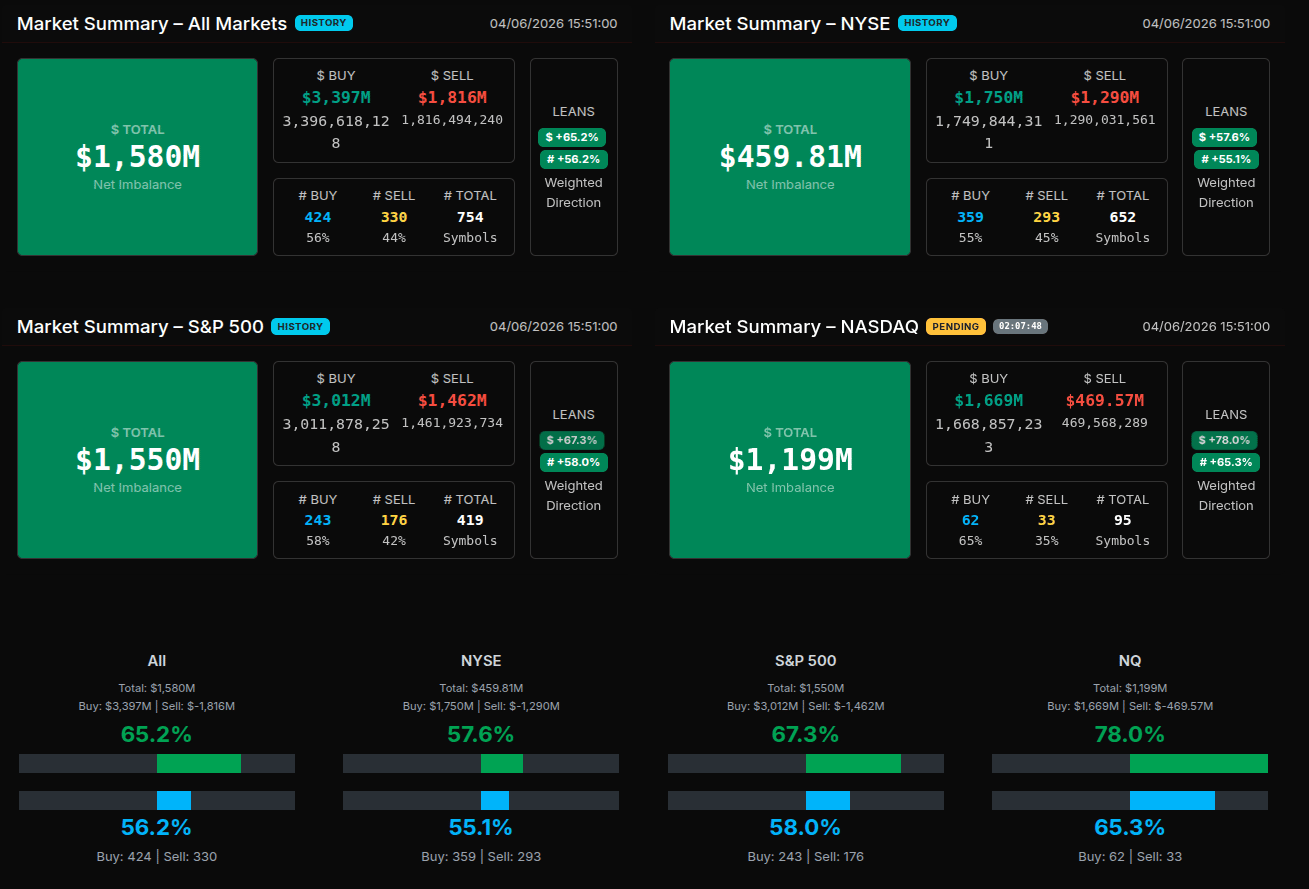The MOC session opened with a sharp imbalance shift from an initial -$4M reading at 15:50 into an aggressive buy-driven tape by 15:51, where net imbalance surged to +$1.58B. Buy programs immediately dominated, printing over $3.3B versus $1.8B for sale, establishing a clear institutional bid early in the auction window. From 15:51 through roughly 15:55, the tape remained consistently buy-heavy, with $PCT readings holding in the 61–68% range—firmly directional rather than rotational.