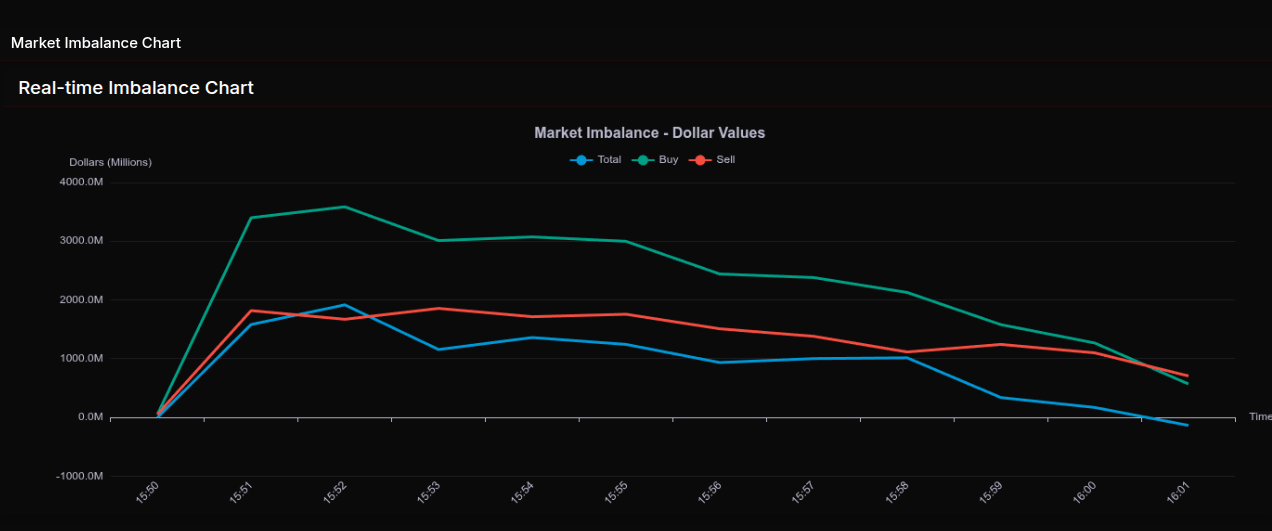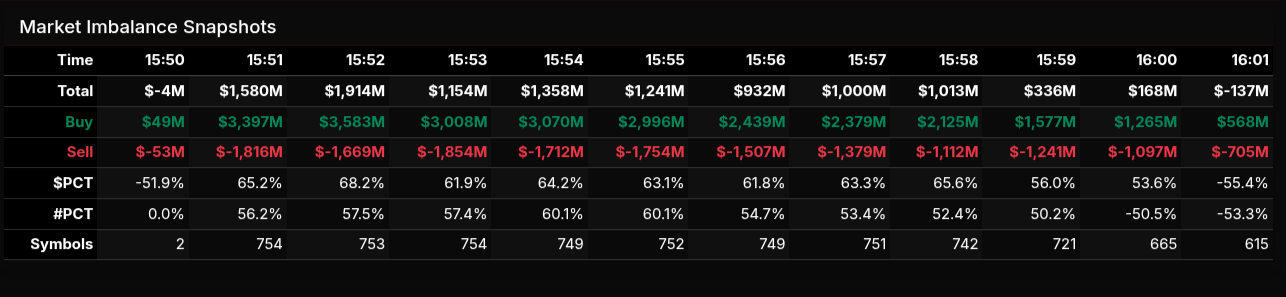 As the session progressed, however, the imbalance began to decay. Buy notional steadily declined from peak levels (~$3.5B) down toward ~$2.1B into 15:58, while sell pressure stabilized rather than expanded. This created a compression phase, reflected in $PCT drifting toward the mid-50s by 15:59, signaling a transition from strong directional flow into a more rotational environment. By the close (16:01), the imbalance flipped negative (-$137M), indicating late sell-side dominance and a meaningful reversal in auction pressure.