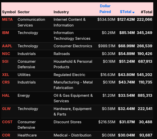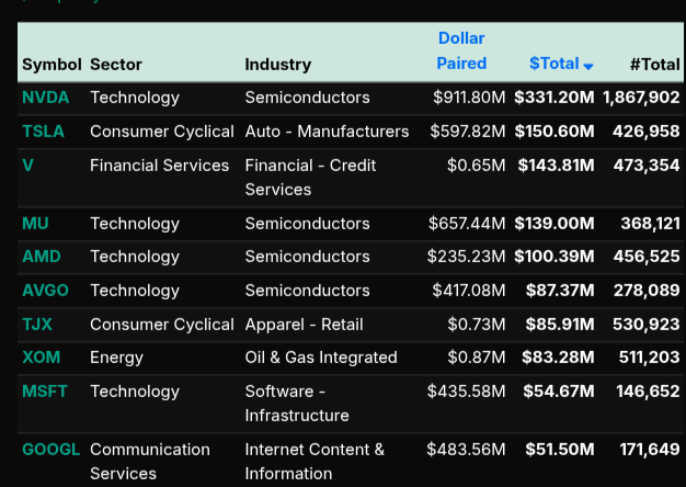 Single-name flows reinforced this bifurcation. On the buy side, NVDA (+$331M), TSLA (+$150M), and V (+$143M) led, alongside semiconductor strength (MU, AMD, AVGO), confirming growth and beta demand. On the sell side, META (+$127M sell imbalance), IBM, and AAPL showed distribution, indicating selective profit-taking within large-cap tech despite broader sector strength.