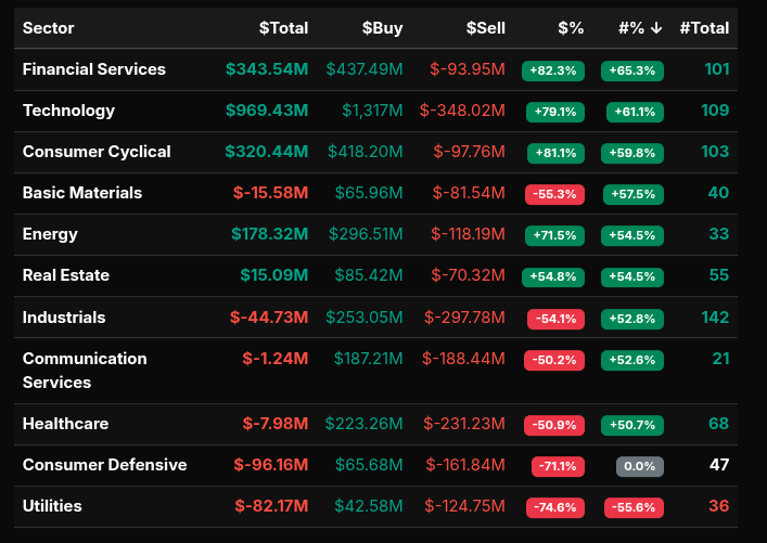 Sector flows were broadly constructive early, with Technology (+79.1%), Financials (+82.3%), and Consumer Cyclical (+81.1%) showing strong buy-side conviction—well beyond the >66% threshold that indicates wholesale accumulation. Energy (+71.5%) also qualified as a strong buy sector. In contrast, Utilities (-74.6%) and Consumer Defensive (-71.1%) exhibited clear institutional selling, both exceeding the -66% threshold, suggesting defensive rotation out of safety.