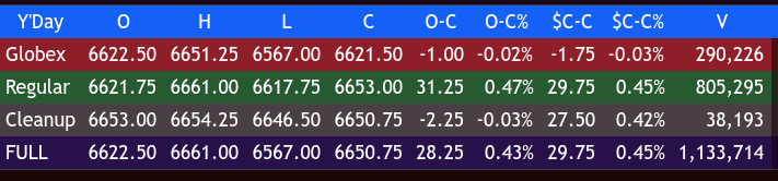 • Overnight gave a classic Sunday Globex dip (around 6575) that was quickly bought, recovering back toward 6650.