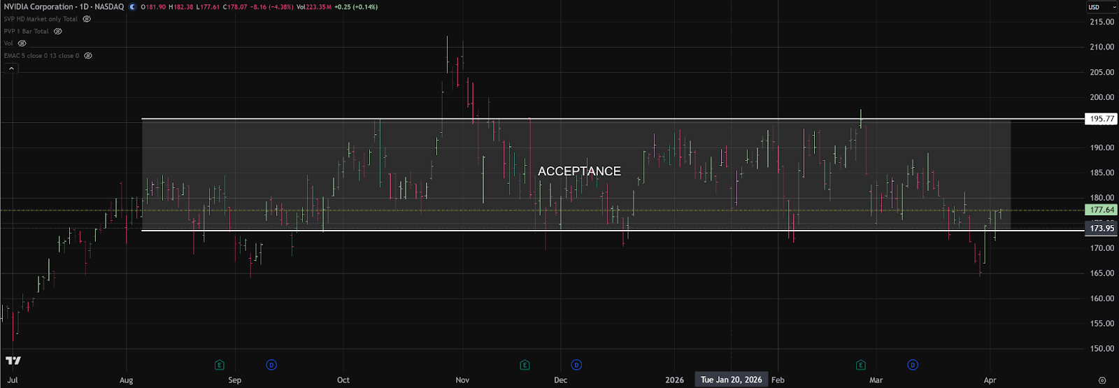 NVDA continues to mirror the broader technical structure seen in XLK, which is notable given its approximate 15% weighting in the sector ETF. Since August, price has largely been contained within a well-established acceptance range between roughly 174 and 195. Although shares briefly broke below the lower boundary, that move failed to gain traction and was quickly reversed, signaling a lack of sustained selling pressure below accepted value.