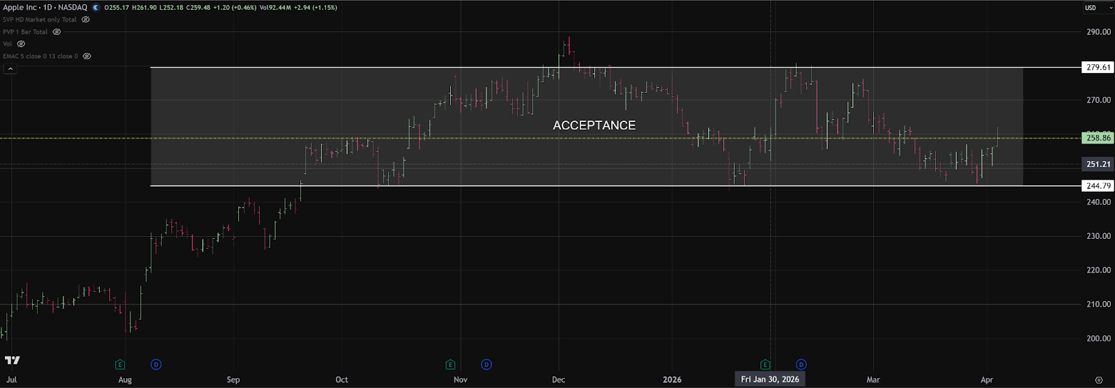 AAPL is showing a similar technical profile, with price spending the last several months auctioning within a clearly defined acceptance range between roughly 245 and 280. Recent weakness tested the lower end of that established value area, but sellers were unable to drive sustained trade below it.
