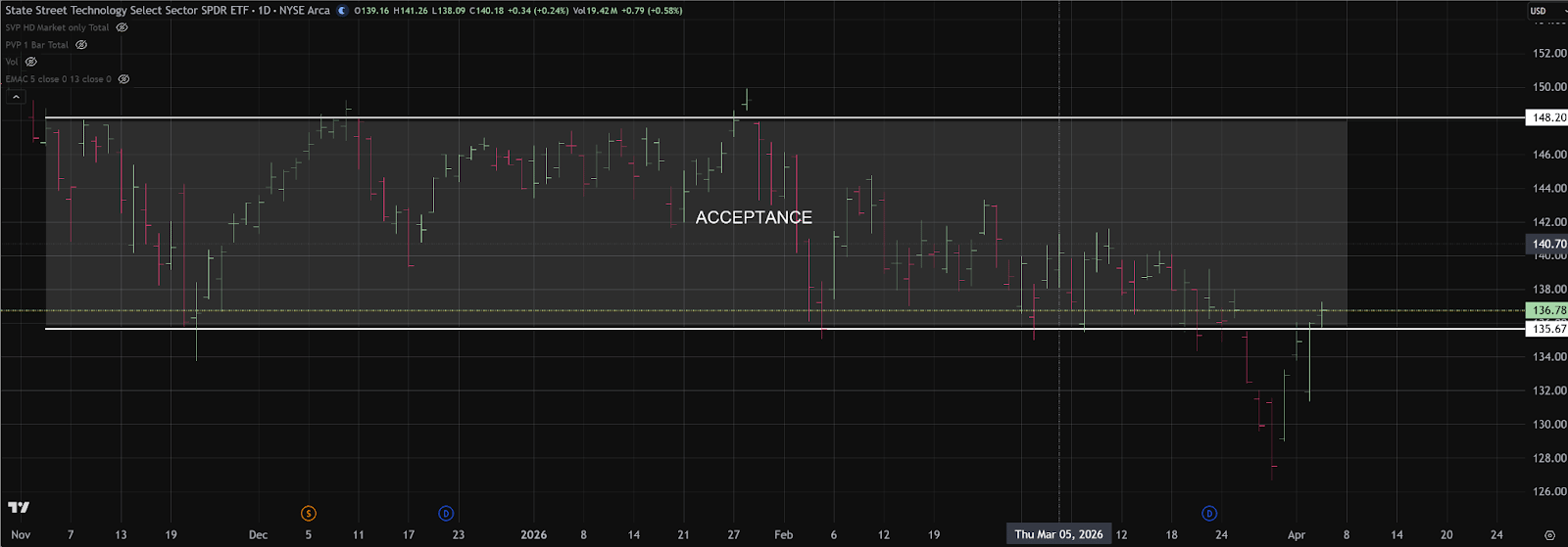 XLK remains in a well-defined multi-month trading range, with sustained two-way auction between roughly 135 support and 149 resistance since November. The recent break below 135 failed to attract meaningful continuation, and last Thursday’s recovery back into the prior value zone signaled renewed acceptance within the established range.