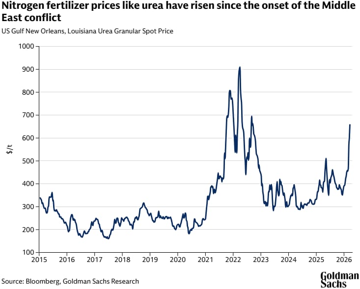 The Strait of Hormuz is a critical route for the world’s nitrogen fertilizer market, which is especially important for crops like corn and other grains. Disruption to the Strait because of the war in Iran could drive up prices for fertilizer and agricultural products around the globe, according to Goldman Sachs Research.