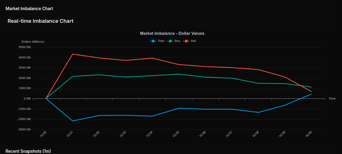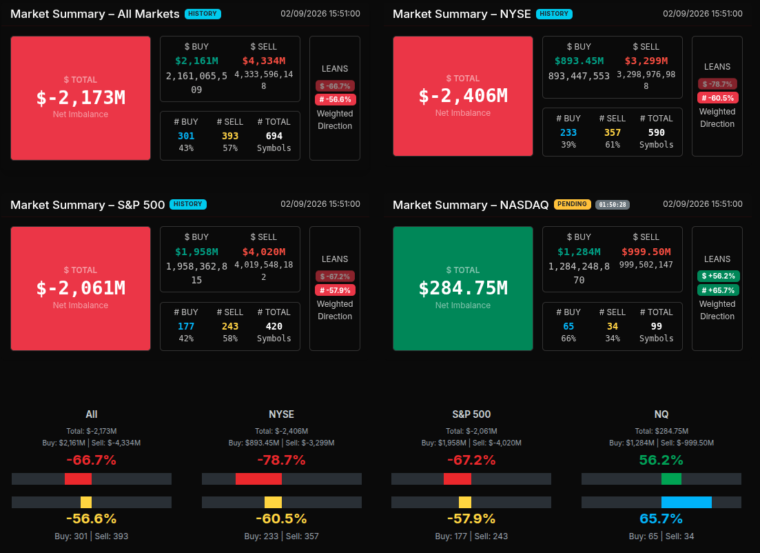 The February 10th MOC opened with a modest buy-lean before quickly shifting into a wholesale sell program. At 15:50 the tape showed a small +$16M buy imbalance, but by 15:53, the auction flipped hard to -$412M and accelerated to a peak -$945M sell skew at 15:54. The $PCT reading pushed to -56% to -57% during the heaviest pressure, signaling broad-based institutional supply rather than simple rotation. Sell interest remained dominant through 15:57 before a sharp counter-rotation at 15:58 briefly swung the book back to +$288M. Into the bell, the imbalance settled nearly flat at +$10M, reflecting a late cross that neutralized earlier extremes.