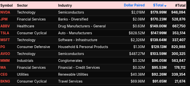 Single-name flows highlight the divergence. TSLA dominated the buy side with over $1B paired, joined by VZ, GE, AXP, and XOM. Meanwhile, mega-cap tech drove the sell program: NVDA ($233M sell), AAPL ($204M), PANW ($139M), MSFT ($86M), and META ($122M) anchored the pressure. The NASDAQ complex closed with a -$448M net imbalance and a -56.7% lean, reinforcing tech weakness, while the NYSE finished strongly positive at +$465M and +56.6%.