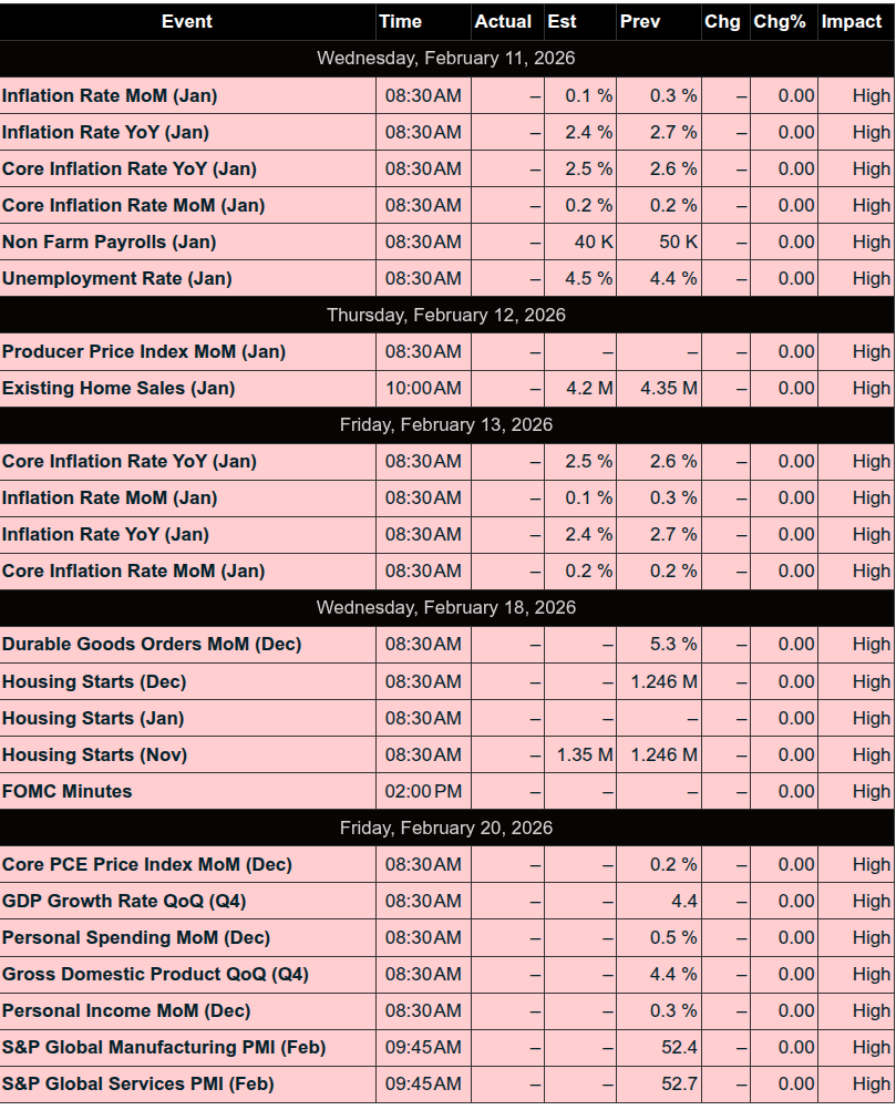 • Focus: Markets await the January Jobs Report at 8:30am ET, with wide-ranging estimates (10K–135K) and expected unemployment at 4.4%. Revisions to 2025 data may show weaker prior job gains. ADP signals a still-brutal job market for the unemployed.