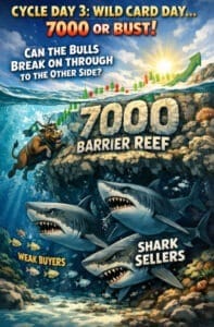Price is still slammed up against the 7000 “Barrier Reef”—and every time bulls poke their head above the water, the Shark Sellers are already circling. No hesitation. No mercy. Weak hands get chewed up fast.