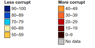 A higher score indicates greater transparency (i.e., less corruption). The score ranges are: