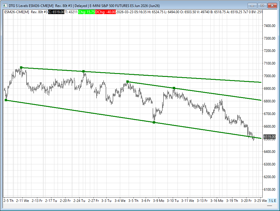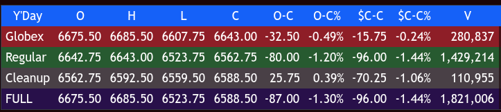 The ES rallied up to 6616.25 at 12:20, sold off down to a higher low at 6595.25 at 12:50, rallied up to 6609.75 at 12:55, and sold off down to 6581.25 at 1:45. It then rallied up to 6593.00 at 2:00, and that’s when a big sell program hit that pushed the futures down to 6523.75 at 3:35.