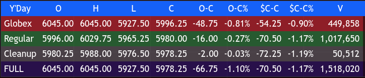 The Cleanup session (4:00 PM ET until 5:00 PM ET) saw the market close at 6030.00. From the previous cash close to Friday’s cash close ($C-C), the ES was down 71.50 points, or -1.17%. The day’s open-to-close (O-C) in the regular session was down 16.00 points, or -0.26%. The full session closed down 67.75 points, or -1.11% from its open.