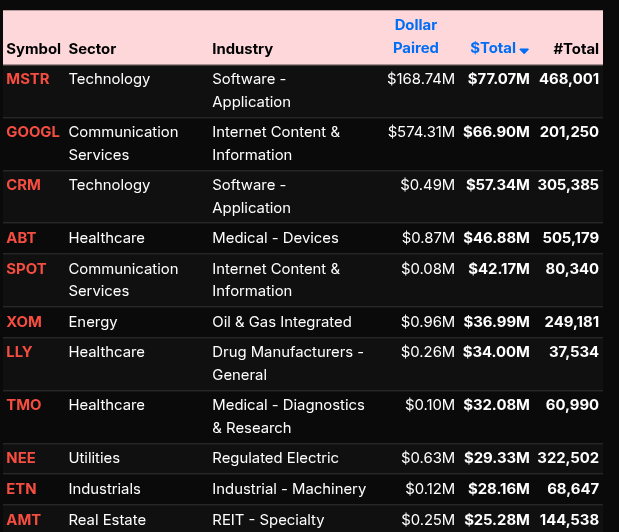 Sector-wise, Technology dominated the activity throughout the session. Names like NVDA, AAPL, AVGO, AMD, and MU led the flow, alongside Communication Services (GOOG, META) and Consumer Cyclical (AMZN). The consistency across mega-cap tech indicates index-driven flows, particularly within the Nasdaq, which showed the strongest lean at +89.7% earlier in the session.