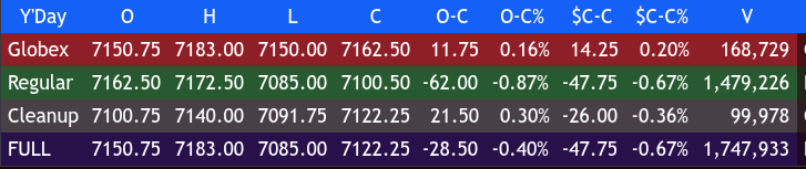 After 4:00, the ES traded down to 7091.75 at 4:05 and then rallied 48.25 points up to 7140.00 after Trump “TACO’ed”, extending the ceasefire until Iran submits its proposal. It sold off down to 7118.25 at 4:45 and settled at 7122.25, down 25.75 points or -0.36%.