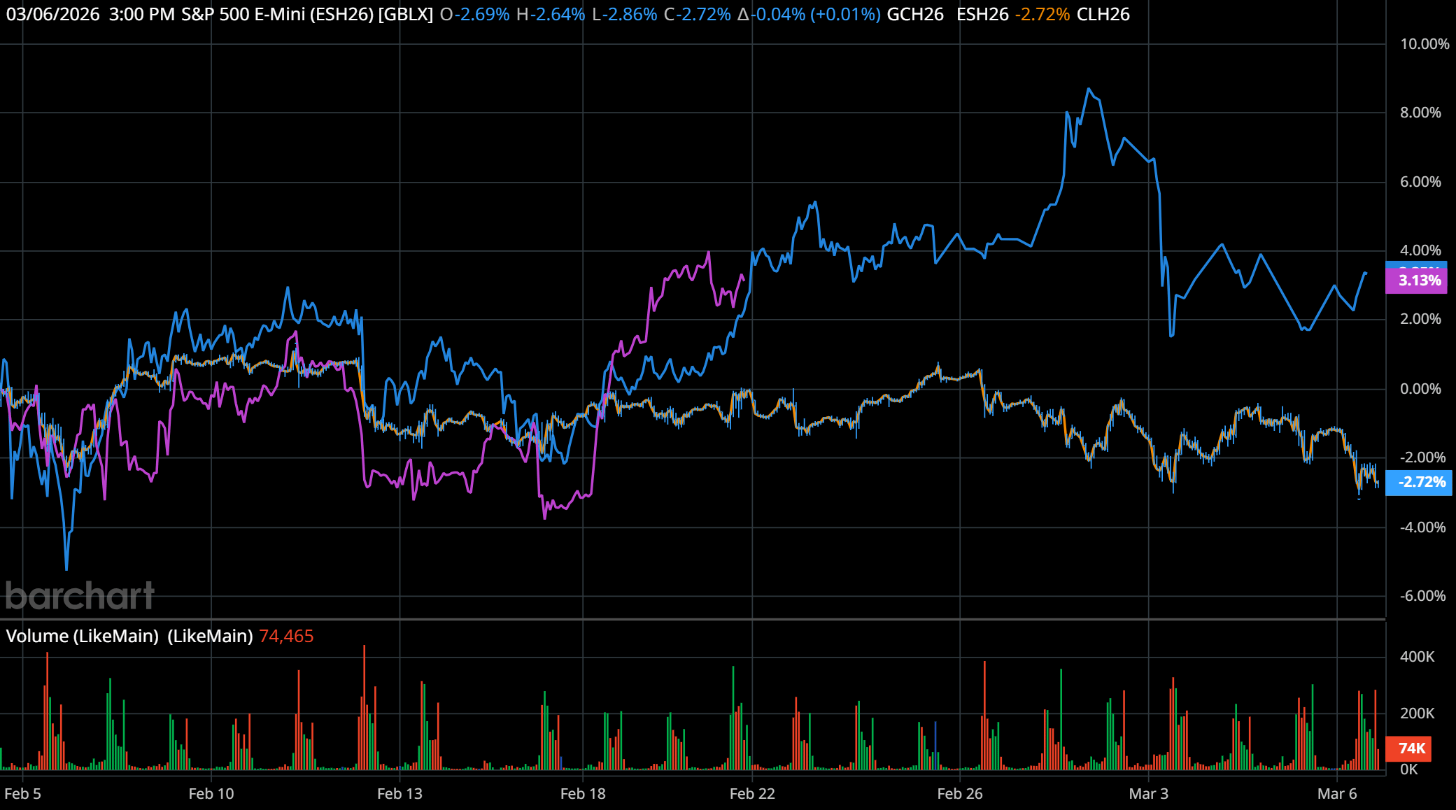 5-Day ESH26 vs GCH26 vs CLH26 Chart