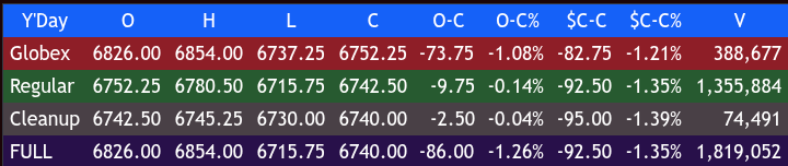 The ES opened FRYday’s regular session at 6752.25, down 82.75 points or -1.23%.. After the open, the ES traded up to 6759.25, sold off 44.00 points down to 6715.25 at 9:55, rallied 62.75 points up to 6778.00 at 10:35, and dropped 35.00 points down to a higher low at 6743.00 at 10:50.