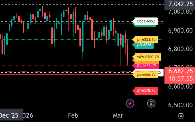 ES is trading around 6682.75, well below the bull/bear line and slightly above today’s lower range target at 6666.75. That makes 6666.75 the first major support to watch this morning. If that level breaks cleanly, downside pressure can extend toward 6578.75. As long as price holds above 6666.75, sellers still have the edge, but a breakdown has not fully opened up yet.