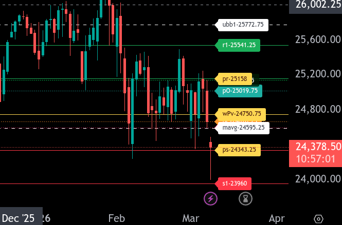 Overall, the market remains weak below 24750.75. Bulls need to recover 24595.25 and then reclaim the bull/bear line to shift momentum back upward. Until that happens, the focus stays on whether 24343.25 can hold, because failure there opens the door to 24000.00 and 23960.00.