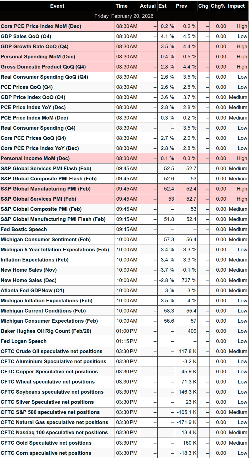 Markets are focused on several major catalysts today, led by the Core PCE Price Index (8:30am ET) and a potentially market-moving Supreme Court ruling on Trump-era tariffs. The Court convenes at 10:00am ET and could rule on whether tariffs imposed under the 1977 IEEPA law are legal. Any decision is expected to trigger sharp volatility in either direction.