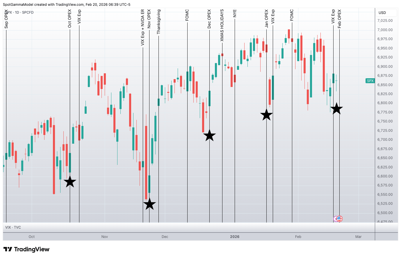 February OPEX is described as a “reliably volatile time” when options flows exert significant influence, with references to binding/holding effects (e.g., gamma pinning) and tools like SpotGamma’s Hero platform for visualizing EMA crosses or gamma flips.