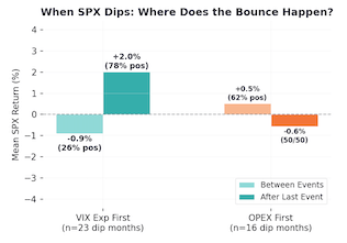 Below you see when VIX exp is first (left side, as with this month) and the SPX is declining into OPEX, we generally see a decline into Friday OPEX (light green “between events”), then a strong bounce out of Friday OPEX (“after last event”). When OPEX is first, that signal is 50/50, as you see on the right (orange plots). In summary: when the SPX sells off into a “VIX exp first” series, it tends to bounce after.