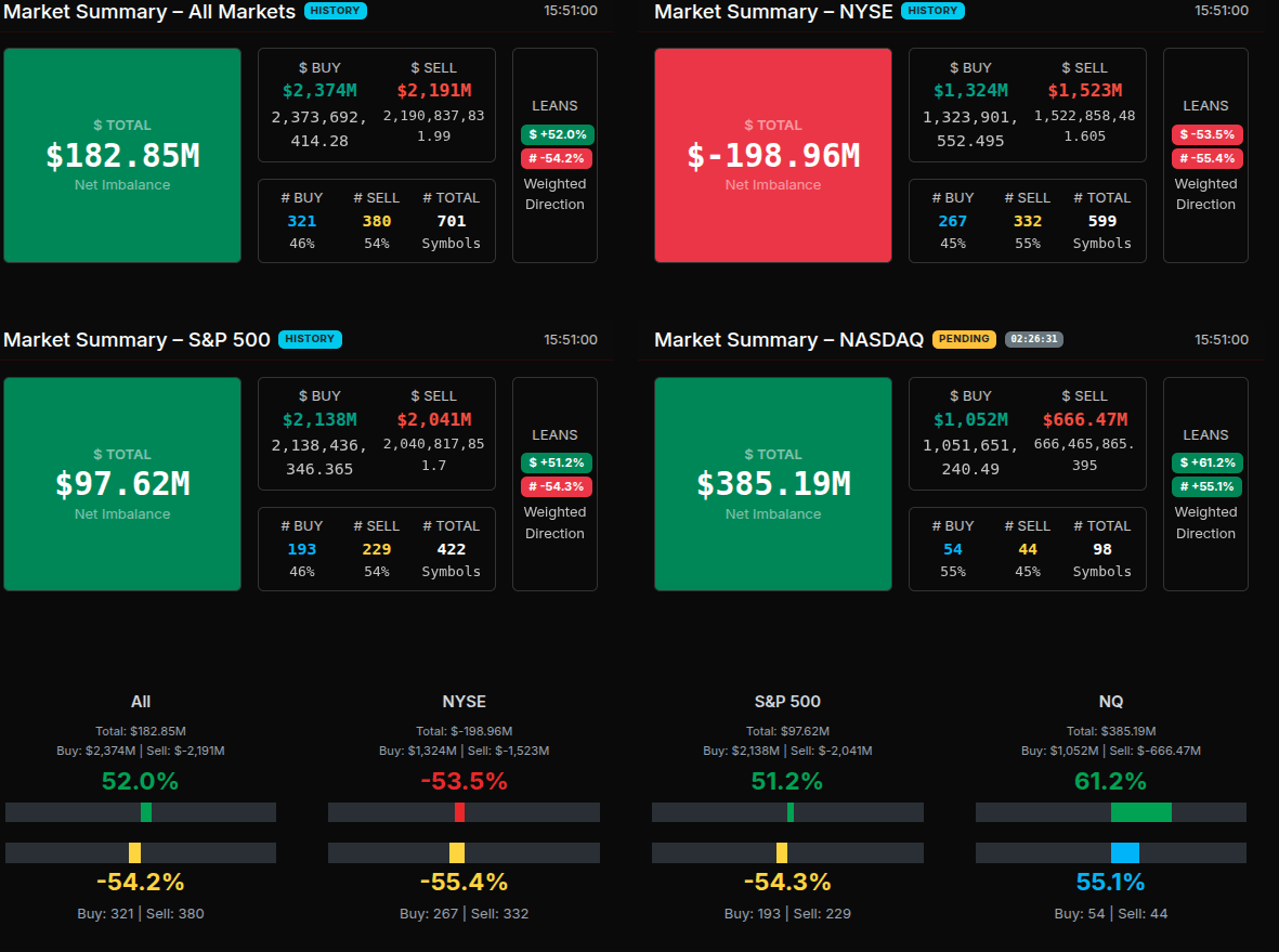 By venue, the NASDAQ dominated, closing with a $385 million net buy imbalance and a +61.2% lean—evidence of concentrated demand for tech and momentum names. The NYSE closed with a -$198 million net sell (-53.5%), while the S&P 500 ended near neutral at +$97.6 million (+51.2%), underscoring the rotational rather than directional nature of the close.