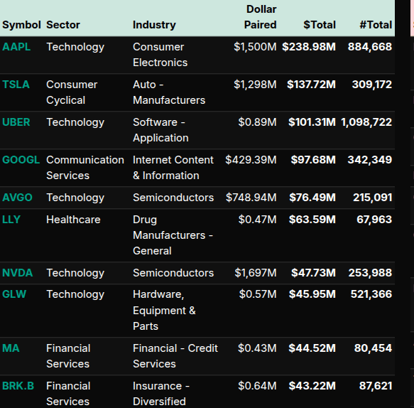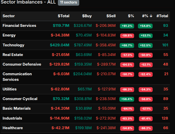 At the sector level, Technology led the market with a massive $429 million net buy, driven by broad inflows into semiconductors and mega-cap tech. Apple (AAPL) dominated the tape with $239 million in total paired volume, followed by NVDA ($47.7M) and AVGO ($76.5M). The group’s +68.7% lean signals a clear wholesale rotation into growth and AI-related names.