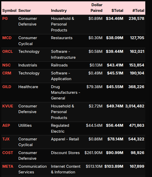 Financial Services followed with a $120 million net buy (+61.2%), paced by strong interest in MA and BRK.B. This was one of the few traditional sectors with sustained inflows. Consumer Cyclical also saw net buying of $70 million (+56.4%), anchored by McDonald’s (MCD) and TJX.