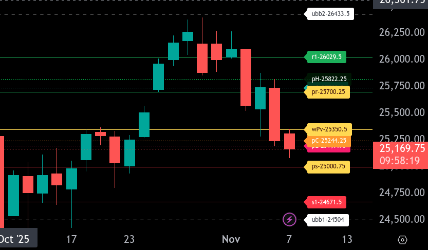 The current structure remains bearish under 25,350.50, favoring short setups on bounces until that level is recovered. Bulls will need to see stabilization above 25,350.50 to regain control and challenge the mid-range resistance at 25,700.25.