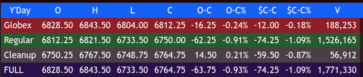 It traded 6750.75 as the 3:50 PM cash imbalance flashed $300M to buy, made a quick pop, and as the NQ started breaking down again, traded 6750.00 on the 4:00 cash close. After 4:00, the ES traded up to 6767.25 and settled at 6747.50, down 77.75 points or -1.14%. The NQ settled at 25,244.25, down 502 points or -1.95%, with tech hit hard by AI-related layoffs.