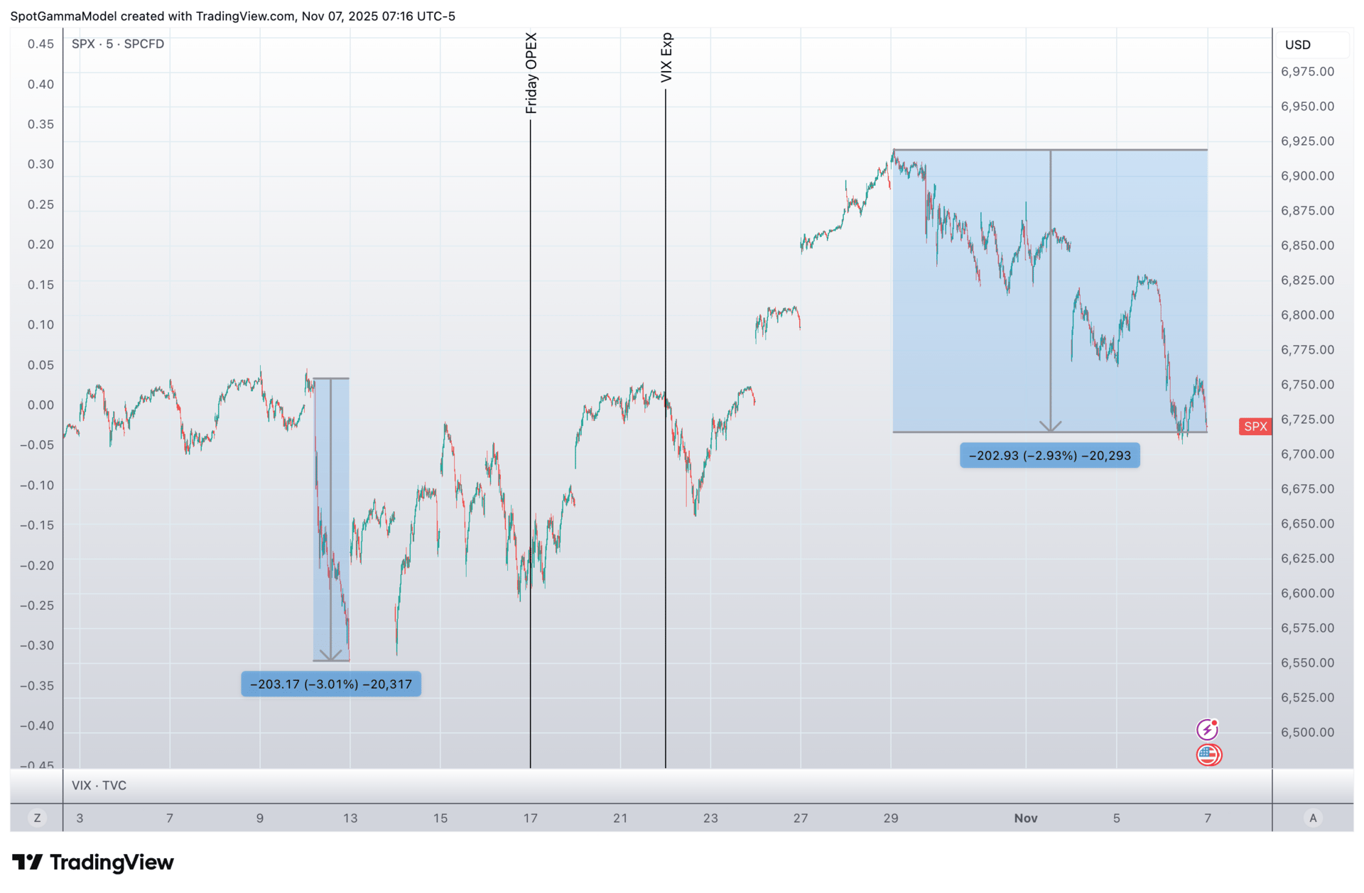 With futures again lower here, we see the SPX decline at ~3% vs 10/29 highs, and quite frankly it feels a lot uglier than that. That 3% is the same decline that we saw into 10/10, but this has definitely been a lot less violet – so far. We hate being alarmists after a 3% drop, but suddenly there is a sneaky bid to vol, and we see nothing but negative gamma for ±50-100 handles. The difference today is that we suddenly see some non-0DTE put buying, and that has largely been absent the last several days. For this reason we are now quite cautious, as this feels like a place wherein things could get “crashy”.