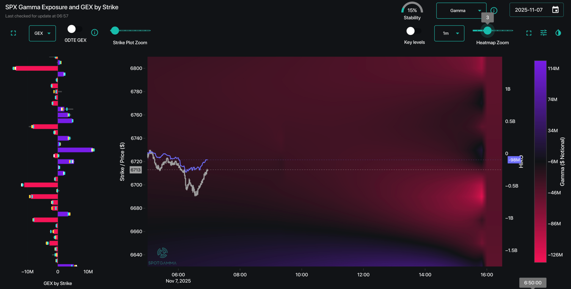 Zooming in, you can see SPX gamma is negative (red) all around current levels, with yesterday’s implied support near 6,700 having faded to 6,600. There is no material positive gamma from non-0DTE contracts at any SPX level (both higher and lower).