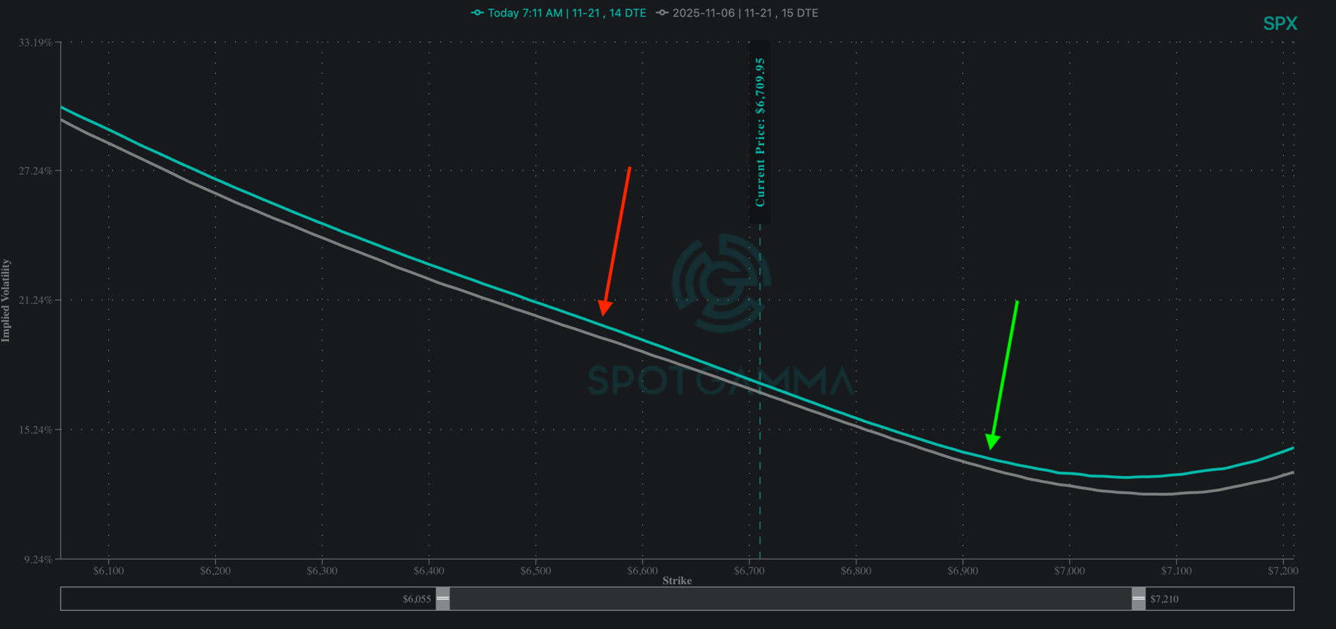 As mentioned at the top, while VIX is still holding 20, we are starting to notice a bid for tails here, and that is a departure vs recent sessions. Here is day-over-day 11/21 SPX skew, with that put wing widening out vs ATM.
